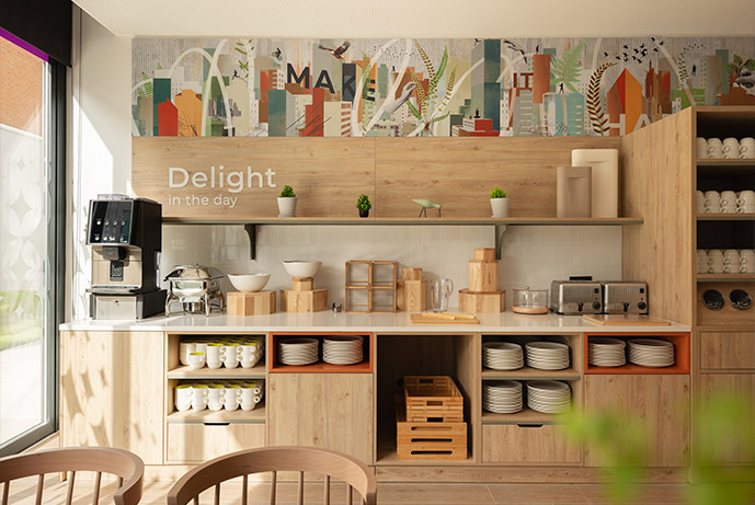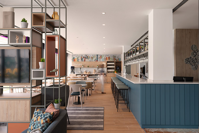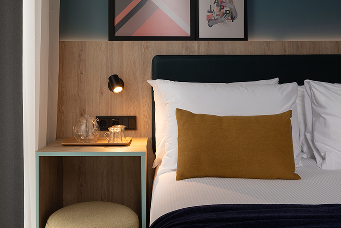 This Premium Economy hotel is located at Albarracín 42, San Blas-Canillejas, with 95 rooms, a lounge with a buffet, several shared rooms with common areas, and rocking chairs for working and socializing.